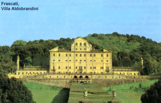 Il primo casino, probabilmente opera di Francessco Capriani da Volterra, come risulta da un disegno dell'Archivio di Stato a Firenze, aveva una pianta pressocché quadrata, con un atrio porticato che introduceva in unsalone profondo quanto l'intero edificio; a lato del salone erano le camere e le scale che conducevano al piano superiore, dove erano le stanze di servizio. Pietro Aldobrandini, nel maggio del 1601, dopo aver chiamato Giacomo della Porta a studiare la trasformazione del casino del Contugi, fece iniziare i lavori di ampliamento del vecchio edificio, volendovi aggiungere un paio di stanze ed una galleria. Giacomo della Porta, però, non soddisfatto di questi modesti laori, propose al cardinale la costruzione di un palazzo degno della sua magnificienza. Il nuovo edificio sostituì totalmente il precedente, del quale non rimase che un muro, che fu collegato con grandissima spesa al nuovo palazzo. Nel settembre del 1602, alla morte di giacomo della Porta, l'edificio era quasi completato, e subentrarono Carlo Maderno (1556-1629) e, per i lavori idraulici, Giovanni Fontana (1540-1614), mentre Giuseppe Cesari,detto il Cavalier d'Arpino (1568-1640), attendeva alla decorazione pittorica del primo piano. L'edificio, che era più lungo del vecchio casino Contugi ma di eguale profondità, fu limitato nella sua costruzione dal monte retrostante. Con l'opera di Carlo Maderno e di Giovanni fontana vennero realizzate la grande sala al secondo piano, la loggia del terzo e le terrazze ai lati del palazzo. Dopo il soggiorno di Clemente VIII, nel 1603 iniziarono i lavori per il giardino con la canalizzazione delle acque. La Villa Aldobrandini si svolge su una serie di regolari alte terrazze, su una delle quali sorge il palazzo. La facciata principale dell'edificio, piena e severa, secondo lo stile di Giacomo della Porta, scandita verticalmente da lesene, si conclude nella parte centrale con una sopraelevazione racchiusa da un enorme timpano spezzato.