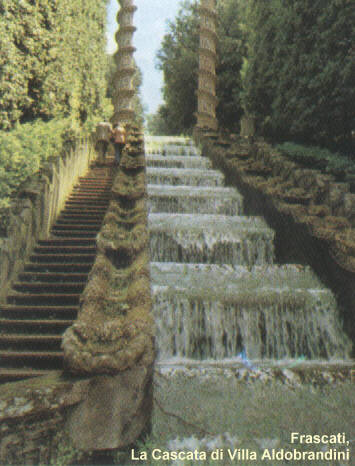 Dietro il Teatro delle Acque è la grande Scala d'Acqua, limitata in alto da due colonne, simboleggianti le Colonne d'Ercole: di cui l'acqua scende fragorosamente, affiancata da due scalinate, con numerosi scherzi d'acqua, che conducono al livello superiore. Nella parte più alta del giardino, in asse alla Scala d'Acqua, erano una fontana rustica ed al culmine la Fontana dei Pastori. Vicino al Teatro delle Acque è un grande mascherone ricavato nella roccia da Guglielmo Mida (1612), mentre sulle terrazze a lato del palazzo sono poste simmetricamente due graziose fontane a forma di navicella, scolpite nel 1607-9 da Ippolito Buti. Sotto al palazzo, nel muro di sostegno della terrazza ovale, è ricavato un nicchione che un tempo era arricchito da una grande quantità d'acqua, realizzato da Giocondo Della Porta e dal famoso fontaniere Orazio Olivieri, l'autore dei numerosi giochi d'acqua della villa. Lo schema compositivo della villa, oltre a presentare un'influenza vignolesca, dal punto di vista planimetrico si riallaccia a Villa Montalto di Domenico Fontana, al cortile del Belvedere ed ai progetti raffaelleschi per Villa Madama. D'altro canto rappresenta l'evoluzione di schemi rinascimentali agli albori del Barocco.